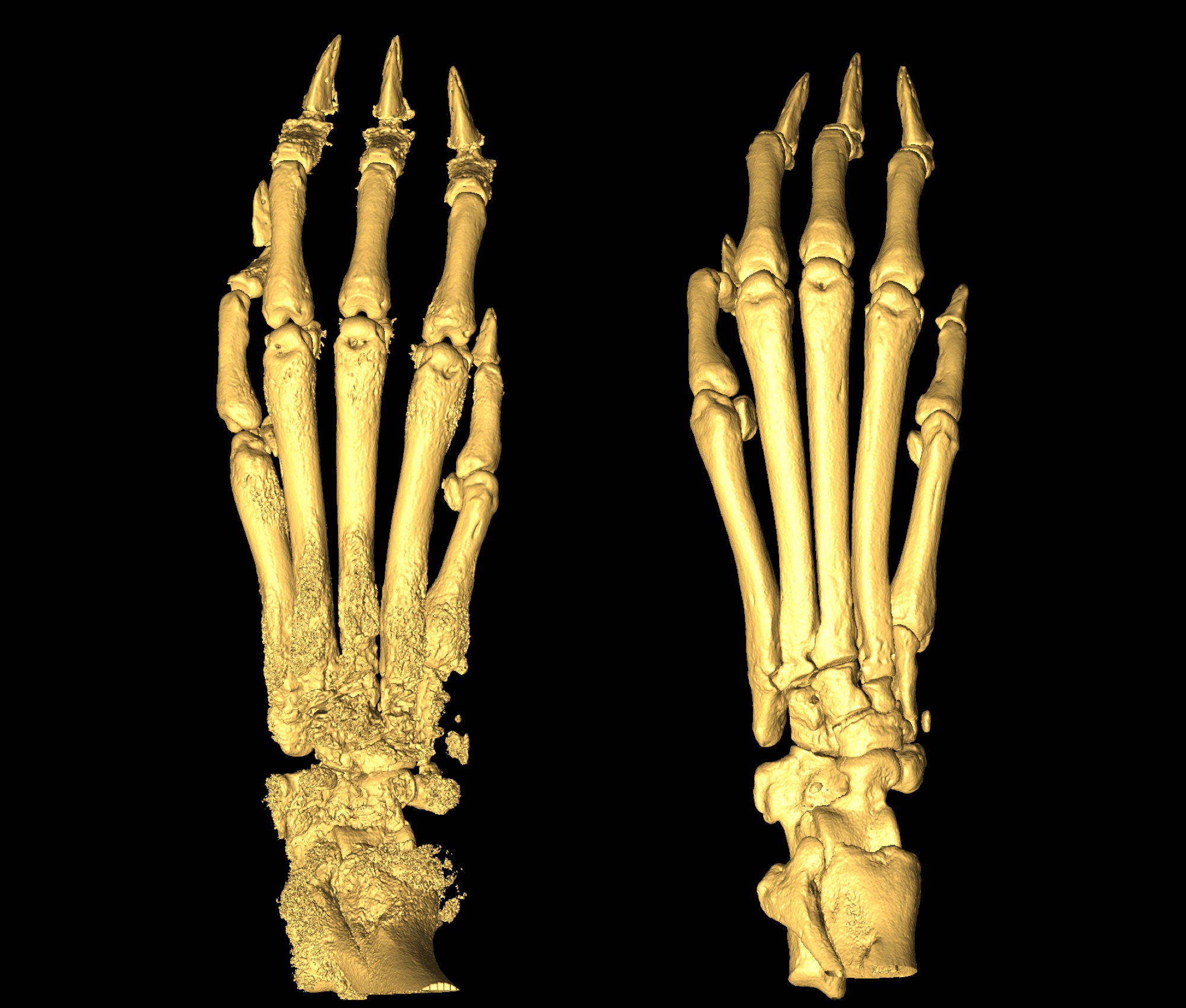 One of my earliest projects was imaging rat paws for a project describing a collgen-induced arthritis model in rats. The right image shows a normal non-arthritic paw, and the left shows an induced arthritis condition. Scans were taken using a SkyScan 1172 desktrop micro-CT and surface renders were created in Amira.